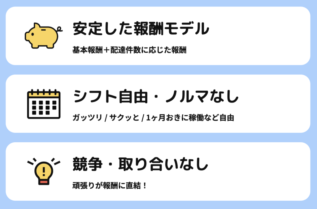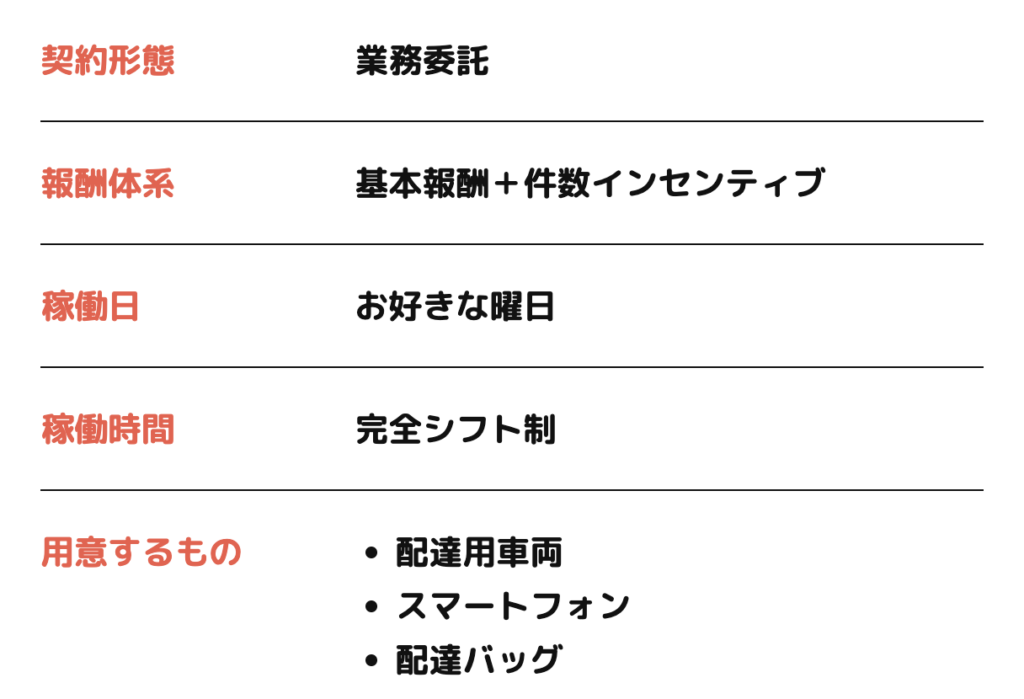| 報酬 体系 | シフト制 基本報酬+件数報酬 | 完全歩合 |