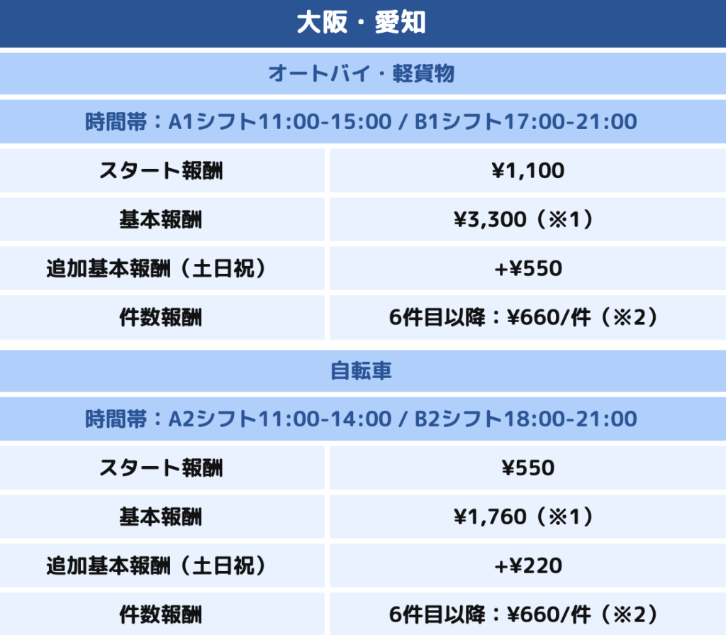 - 平日は「追加基本報酬(バイク+1100円/日、自転車+440円/日)」がないため、その分だけ固定報酬が低くなっています。