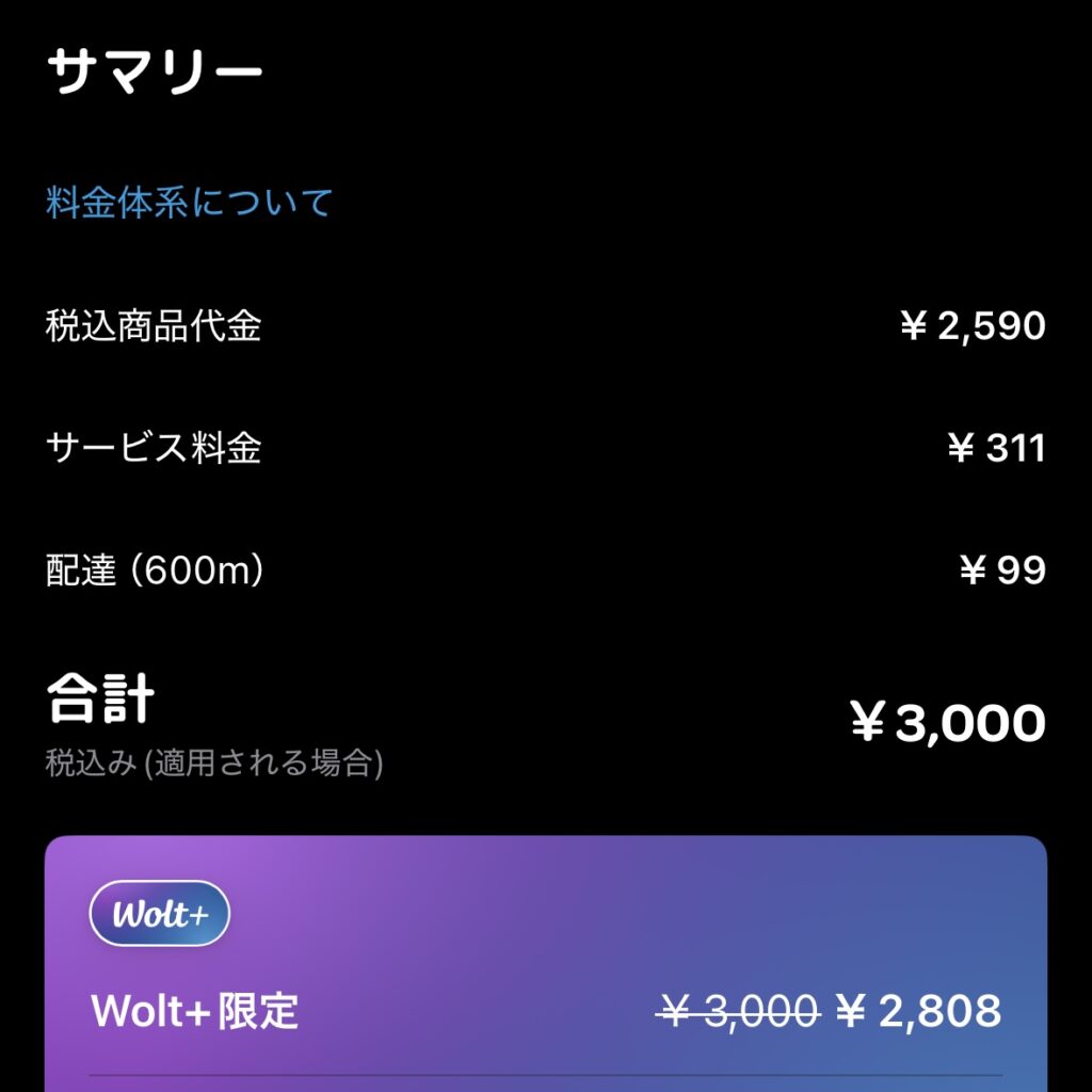 | Wolt | ¥3,000 | ¥2,808 | Wolt+で送料¥99→¥0 さらにサービス料も割引。 |