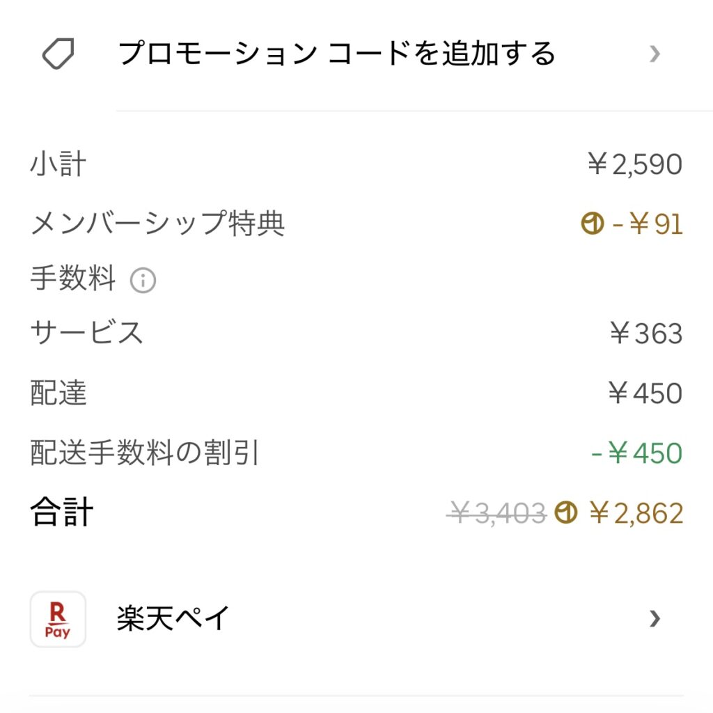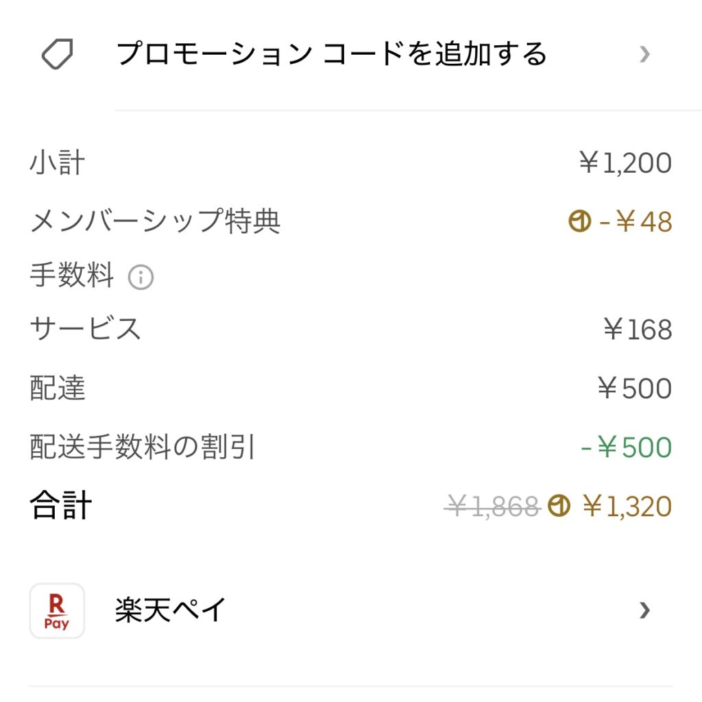 配達パートナーサブスク(Uber One)に入っていないと総額は他のサービスよりも高くなりがちです。