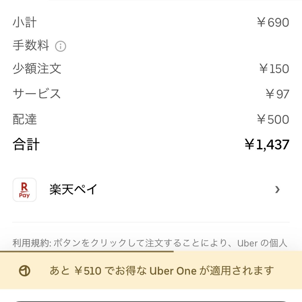 Uber OneやWolt+、LYPプレミアムなどのサブスク特典は、基本的に「1,200円以上の注文」が条件です。 今回の690円のような少量注文では、サブスクに入っていても送料は安くならず、通常料金が適用されるという点に注意が必要です。
