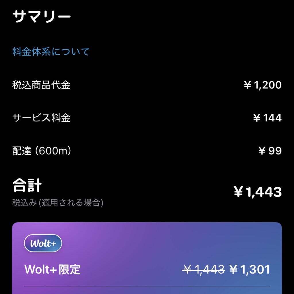 | Wolt | ¥1,443 | ¥1,301 | Wolt+で送料¥99→¥0 サービス料も割引。 |