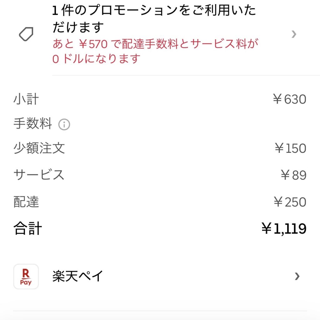| Uber Eats | ¥1,119 | 各種手数料 がかかる | 特典 対象外 |