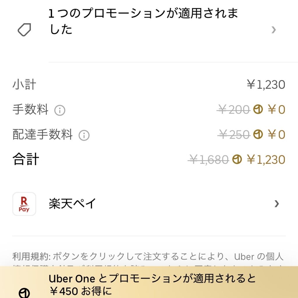 | Uber Eats | ¥1,680 | ¥1,230 | Uber Oneプロモで 各手数料が無料に。 |