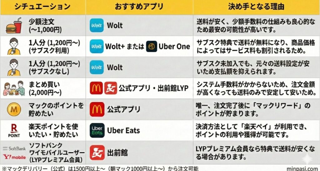 | 少額注文 (〜1,000円程度) | Wolt | 送料が安く、少額手数料の仕組みも 良心的なため、最安の可能性が高いです。 |