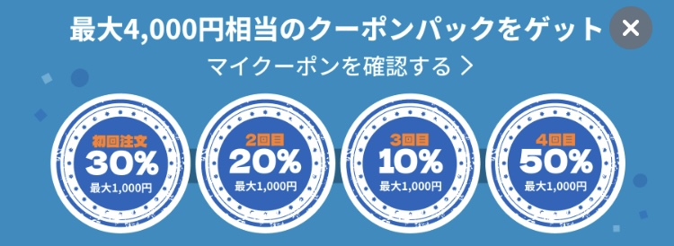 | 特典 | \すぐに使える!/ 合計最大4,000円OFFクーポン 初回:30%OFF(最大1,000円)×1枚 2回目:20%OFF(最大1,000円)×1枚 3回目:10%OFF(最大1,000円)×1枚 4回目:50%OFF(最大1,000円)×1枚 |