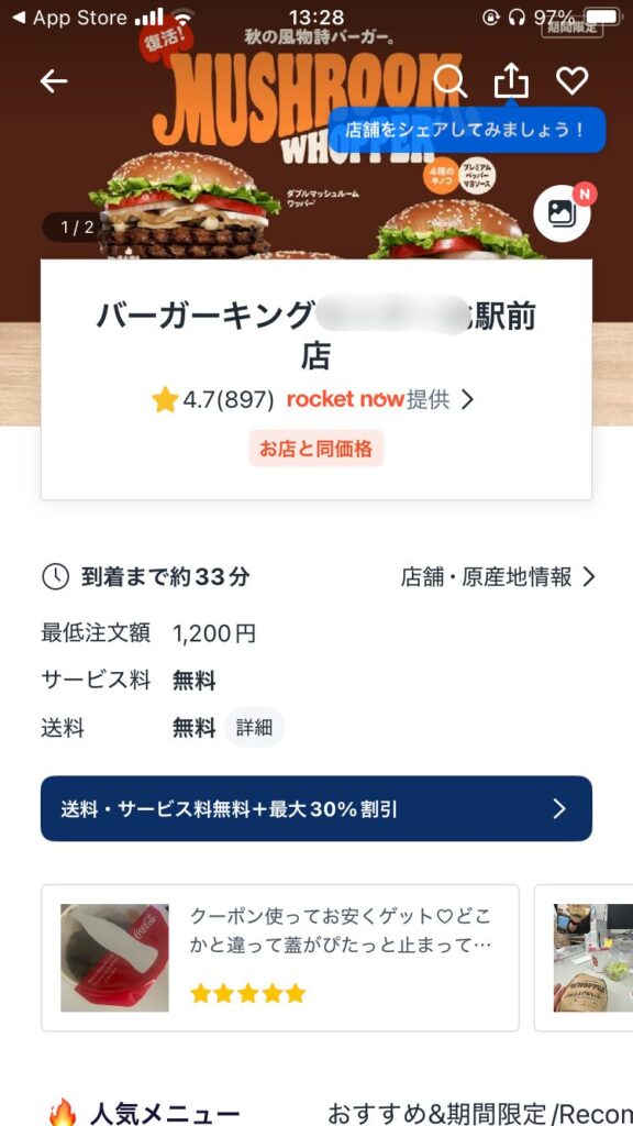 初回クーポンを利用すればお店で注文するよりロケットナウで注文した方が安くなります笑