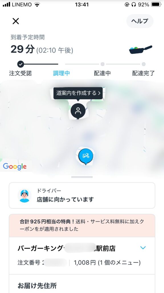 【注文受託】【調理中】【配達中】【配達完了】と、どの工程なのかもわかるようになっています。